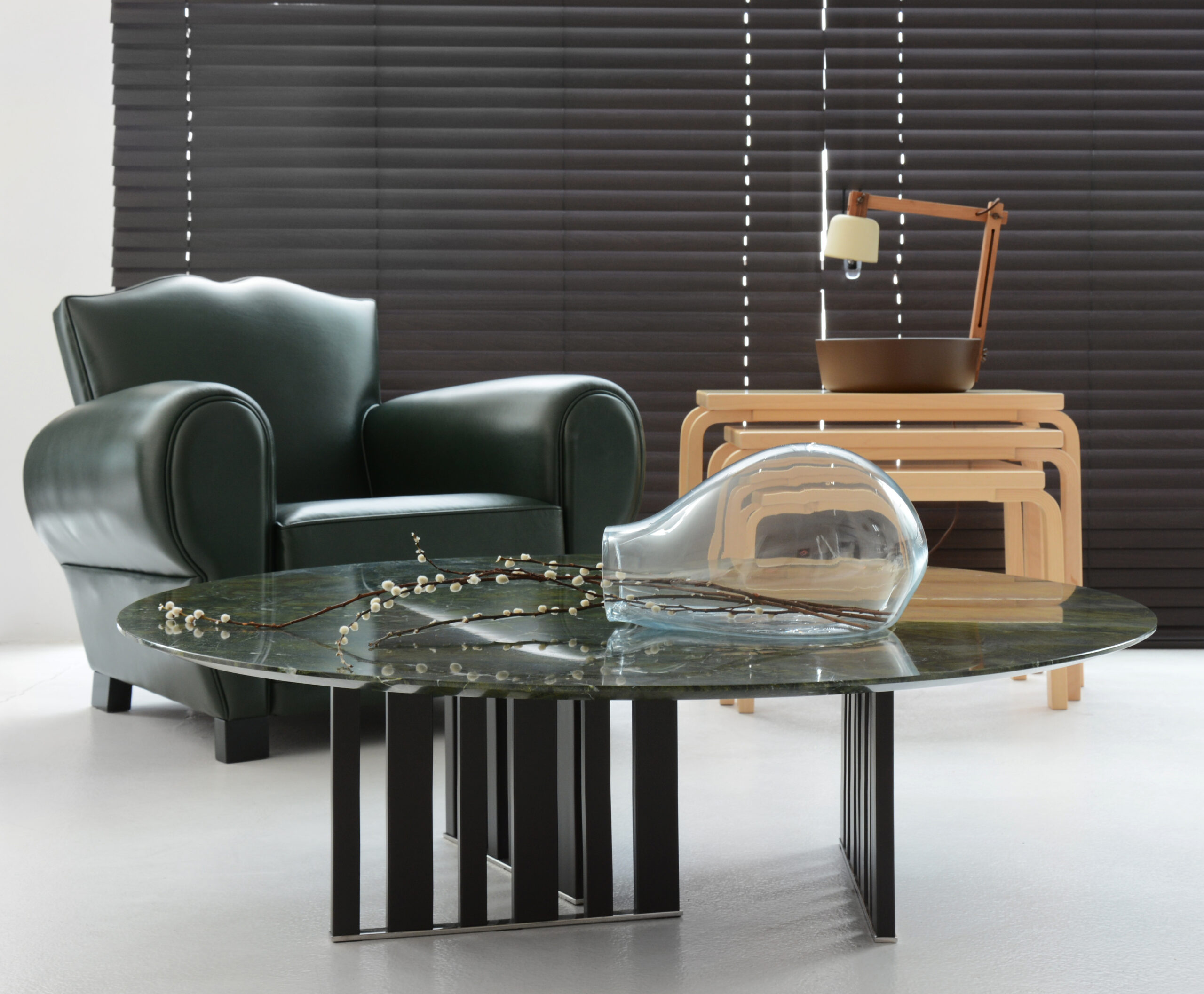 Inspirada na arte cinética, o grande diferencial da linha Angolo está na composição dos elementos e sua variação visual. As peças, através de seu desenho, têm como objetivo transformar sua leitura através do olhar do observador. Desta forma, cria e recria formas dinâmicas de acordo com a posição do usuário ao redor das peças, além das mais variadas sombras.
