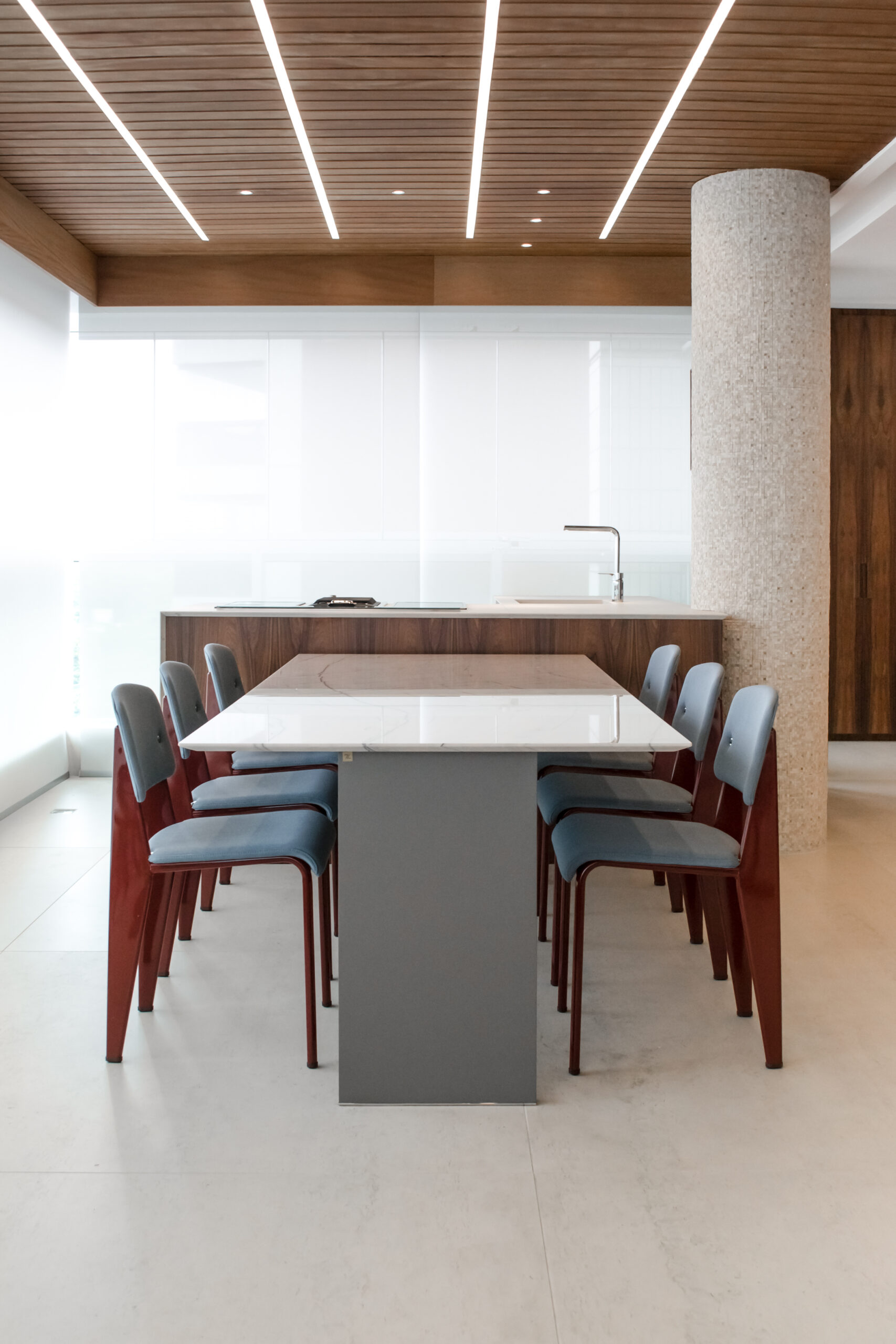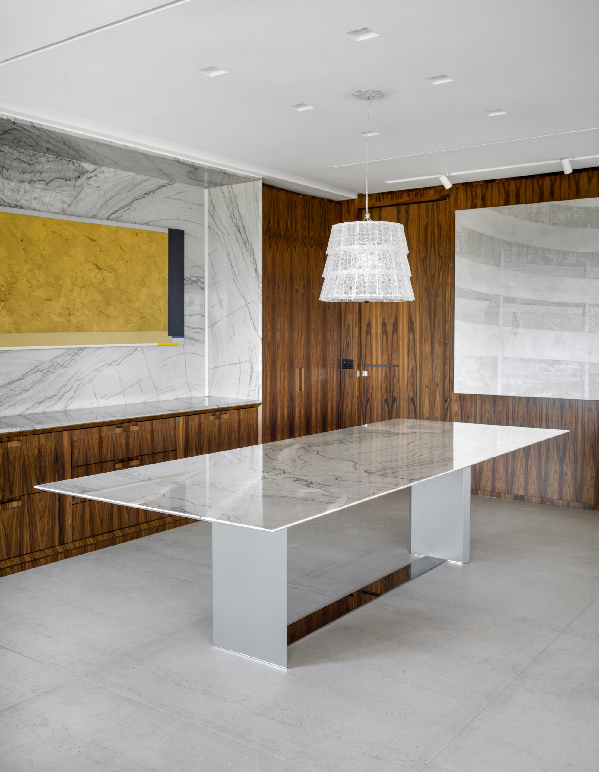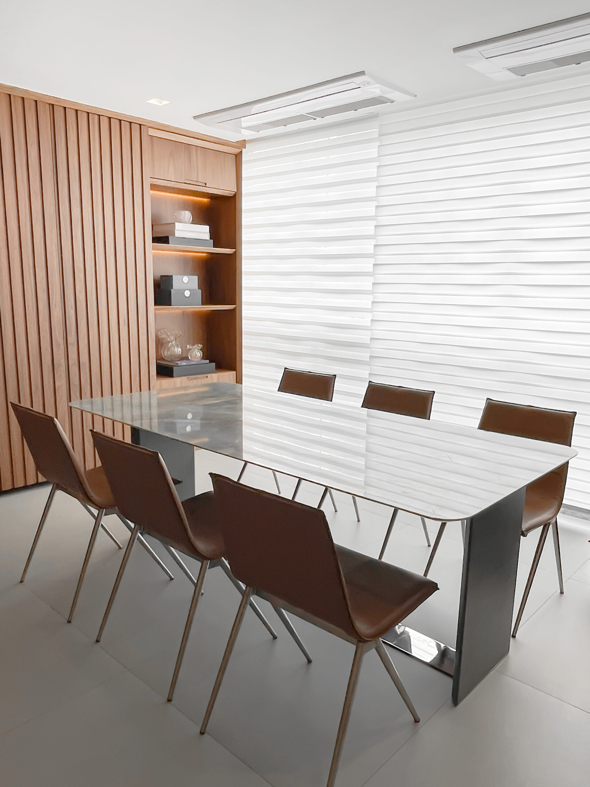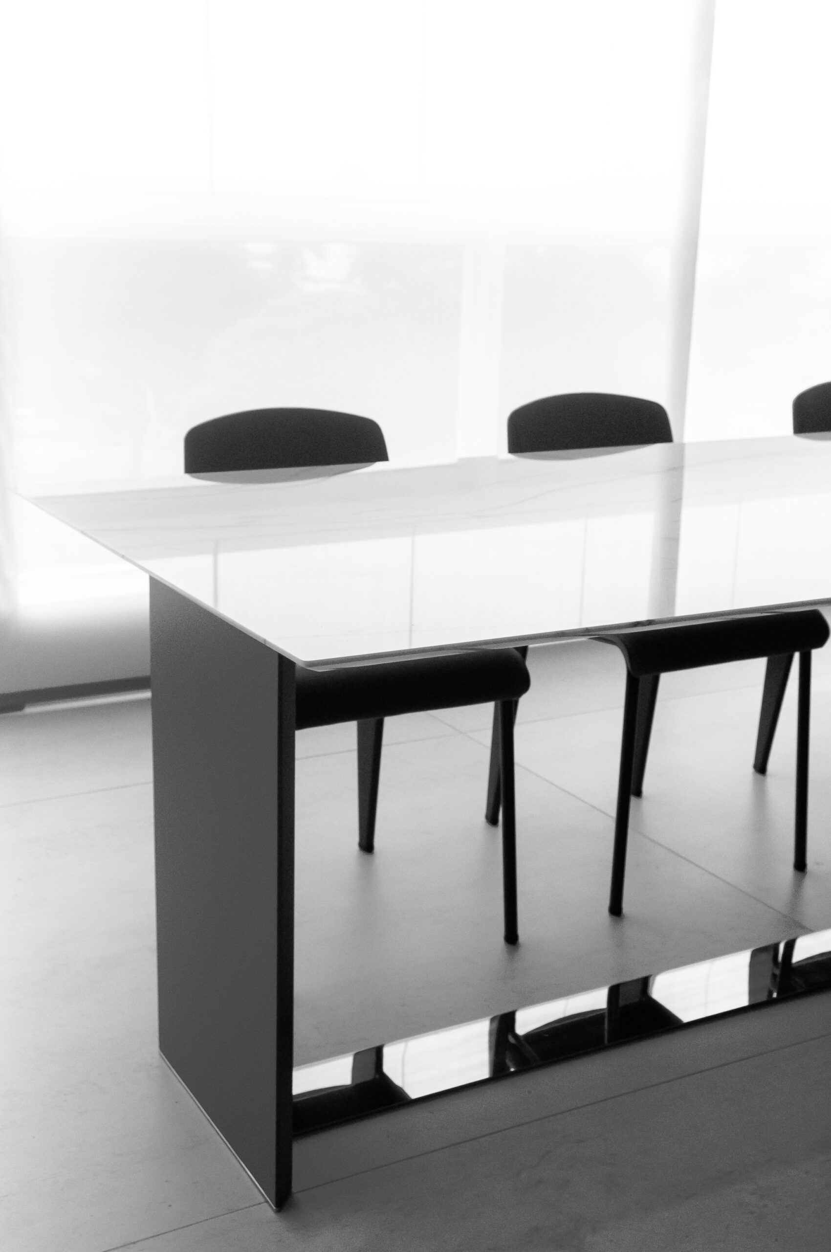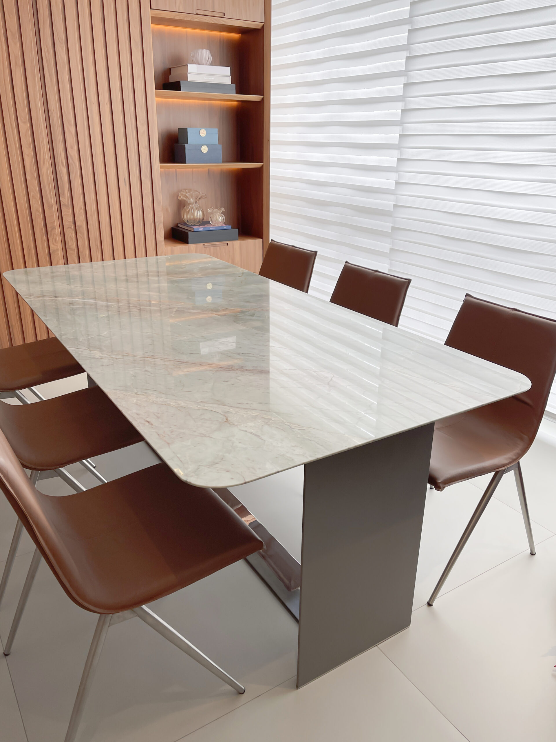 A mesa de jantar Origami se destaca por seu design minimalista e elegante, sustentada por duas estruturas esguias ligadas por um perfil de inox em sua base. Esta peça é uma expressão de sofisticação atemporal, adaptando-se harmoniosamente a diversos estilos de decoração.