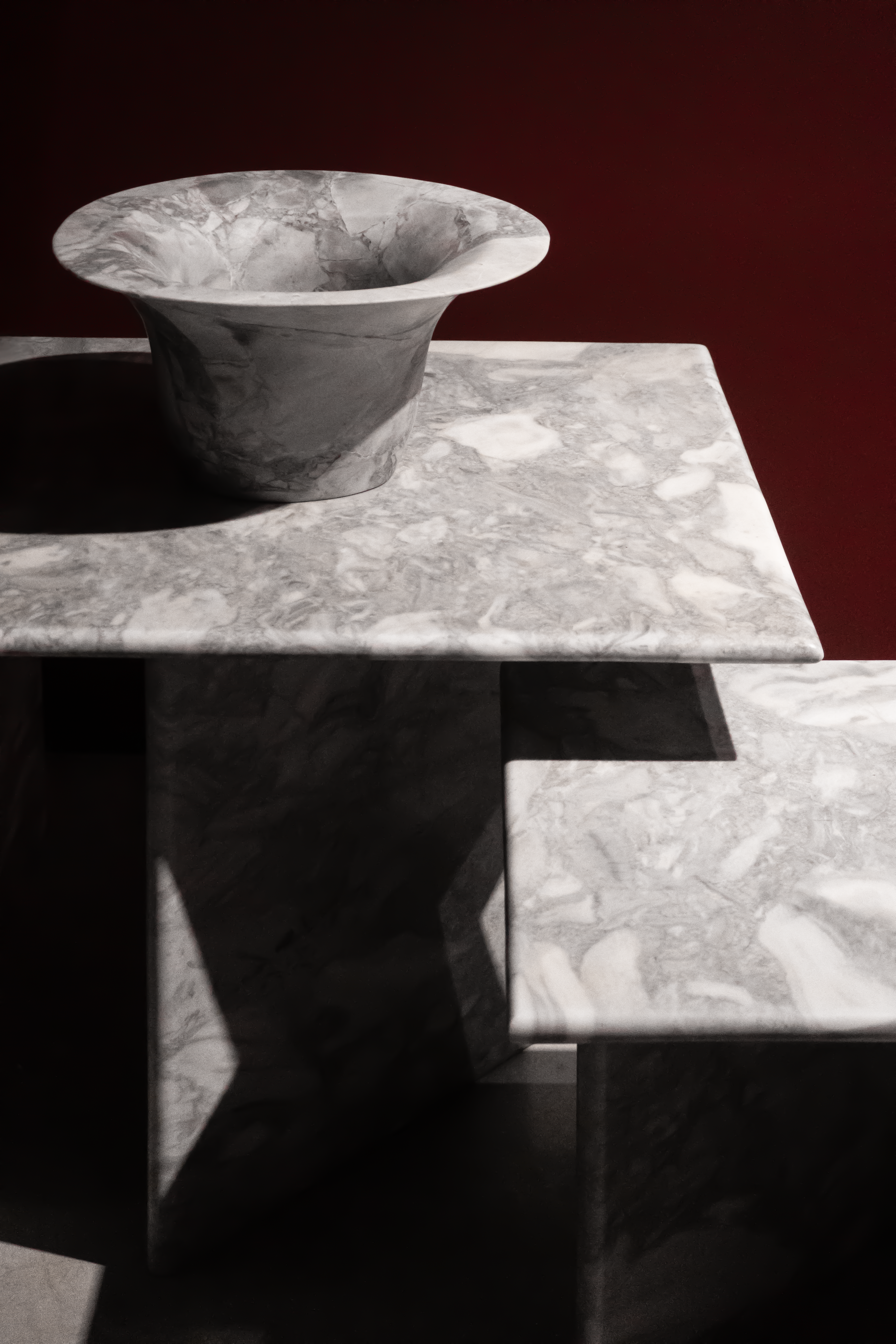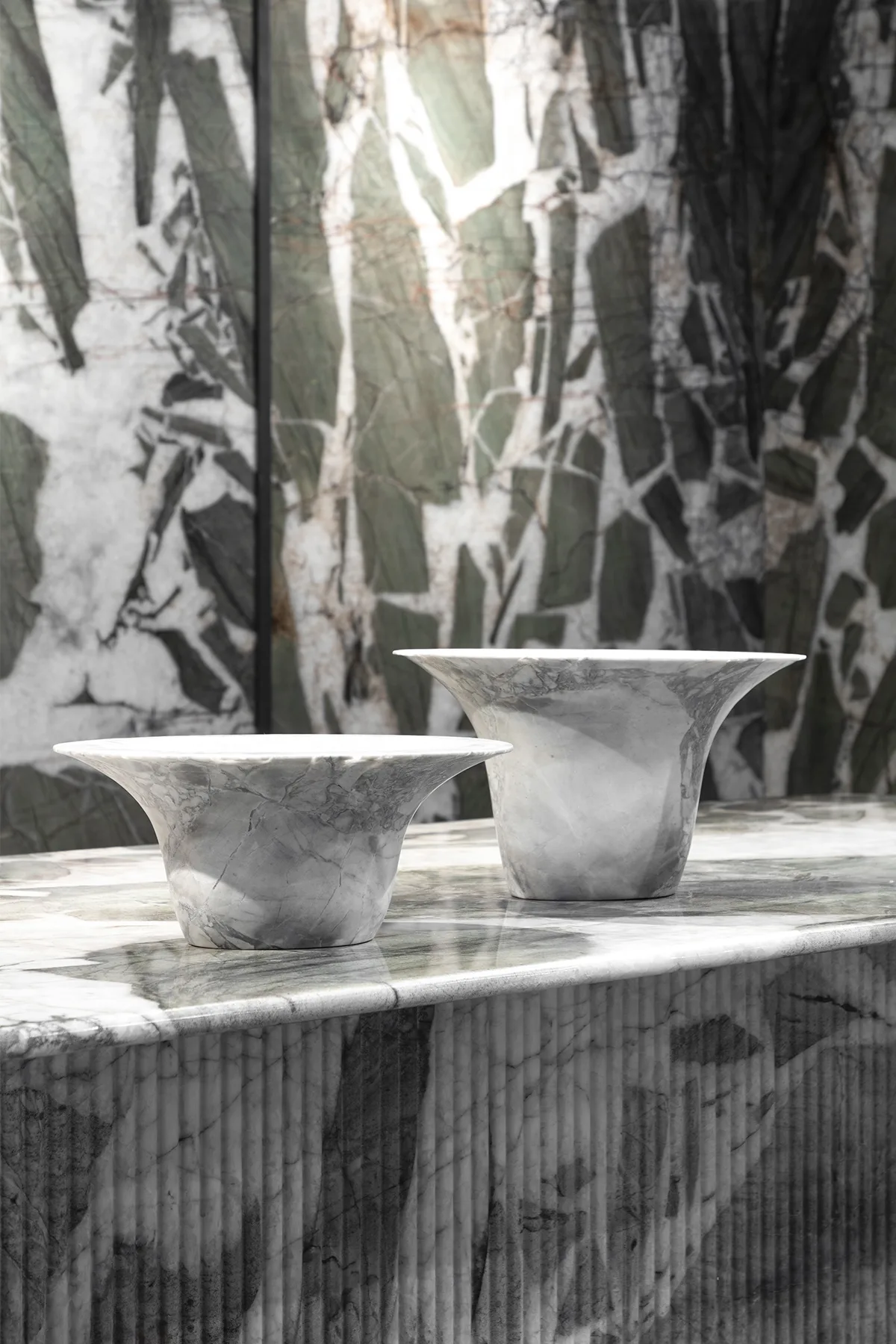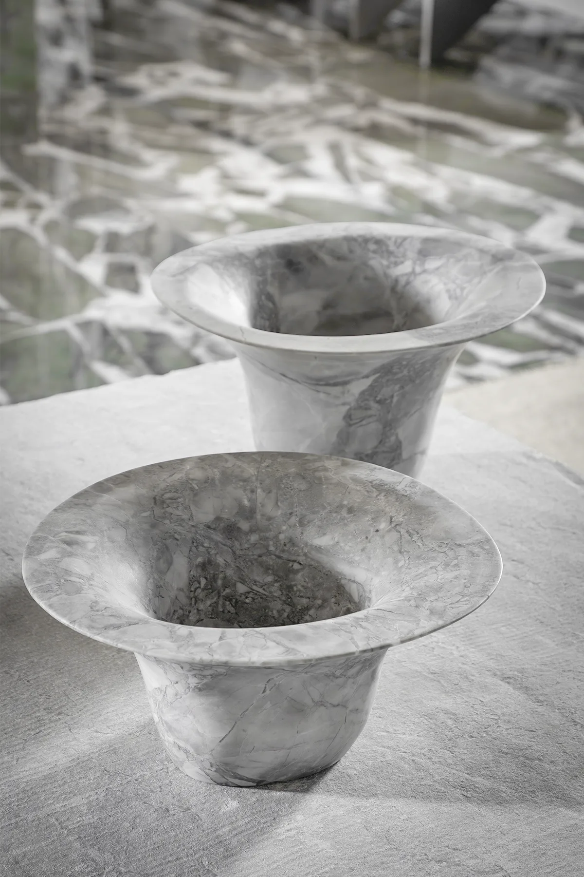 Os vasos da linha Orvalho nascem da imagem delicada de uma gota d’água pousada sobre a folha — arredondada, suspensa, quase em movimento. Esculpidos em rocha natural, eles exploram o contraste entre a leveza do líquido e a densidade da pedra. Suas formas amplas e contínuas parecem brotar da matéria como se a própria água tivesse moldado cada curva com o tempo. Mais do que recipientes, são gestos que celebram o encontro sutil entre água e rocha.