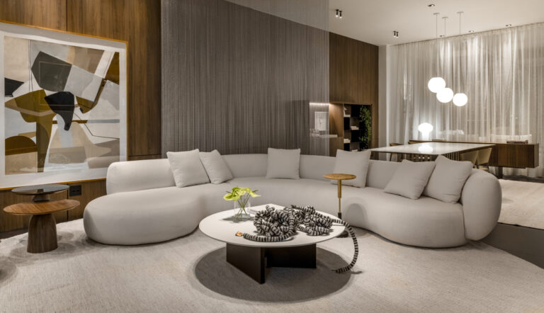 Seu desenho minimalista, geométrico e sofisticado reflete um design simples mas arrojado, criando e recriando formas dinâmicas de acordo com a posição do usuário ao redor da peça.